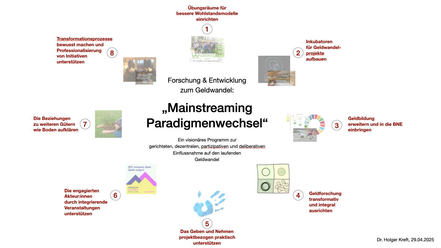 - Überlegungen zu einem humanen und an Nachhaltigkeit orientierten Ordnungsrahmen für das künftige Wirtschaften auf der Grundlage vorhandener innovativer Wirtschafts- und Geldkonzepte im Rahmen von Reforminitiativen