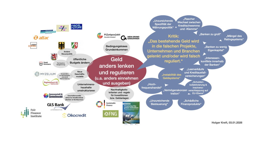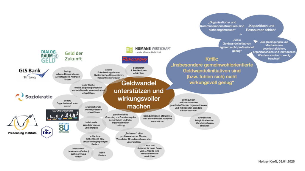 Viele spüren auch: Bei den vielen Möglichkeiten, am Geld, am Geldwesen bzw. in der Finanzwirtschaft etwas zu verändern, ist die Gefahr groß, dass die Energie der Akteur:innen sich zerstreut, Wirkungskraft verloren geht und letztlich keine der gewünschten und dringend notwendigen Veränderungen zustandekommen.