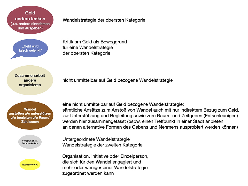 • Große weinrote Schilder und ein braunes Schild mit weißer Schrift stellen die Strategien dar, die identifiziert worden sind. Es sind fünf Wandelstrategien: 1. „Geld anders wahrnehmen“, 2. „Geld anders lenken“, 3. „Geld anders konstruieren“, 4. „Geld in gesellschaftlichen Abläufen anders gewichten“ und 5. „Geldregeln demokratisch bestimmen“. Zusätzlich ist eine wichtige Kombination der Strategien „Geld anders lenken“ und oft „Geld anders konstruieren“ abgebildet: „Geld (anders) – regional und sektoral – ergänzen (Komplementärwährungen)“. Außerdem wurde eine 6. Strategie „Wandel anstoßen u/o begleiten u/o unterstützen u/o Raum/Zeit lassen“ aufgenommen (braunes Schild mit weißer Schrift).