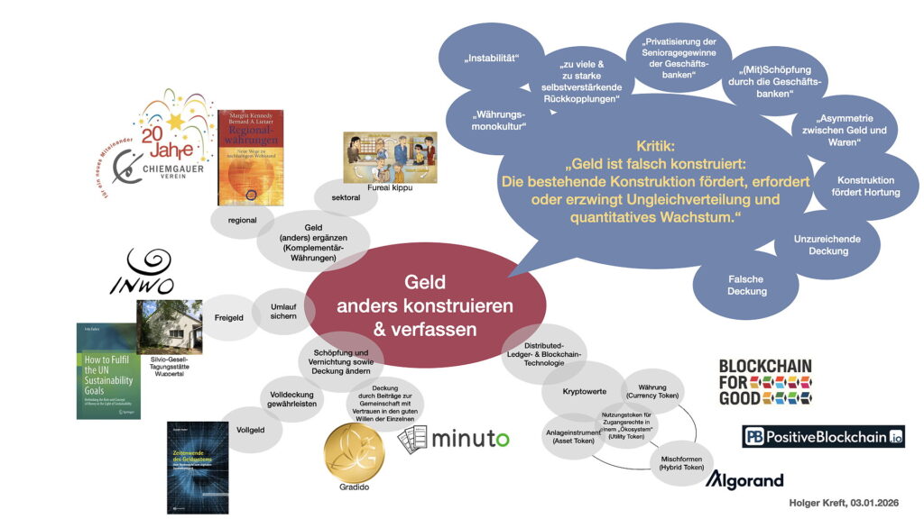 Wahrscheinlich schwerer vorstellbar als alle anderen Wandelstrategien ist die Um- oder Neugestaltung unseres jetzigen Geldes. So wie es jetzt verfasst und konstruiert ist, muss es nicht notwendigerweise bleiben! Reale, regionale Währungsexperimente mit sogenannter Umlaufsicherung (entsprechend dem Konzept des ‚Freigelds‘ nach Silvio Gesell 1920, siehe auch INWO e.V.) zeigen bspw., dass es prinzipiell geht (bspw. das Wörgler Freigeld in Tirol/Österreich und seit 2003 der Chiemgauer in Deutschland). Aber auch eine Volldeckung (‚Vollgeld‚, Joseph Huber, ‚positive money‚) ist denkbar. Weitere Ansätze befinden sich in Köpfen und Schubladen. – Andererseits zeigt uns ja auch die Vielfalt der Kryptowährungen, wie sehr das Geldsystem ständig im Wandel ist.