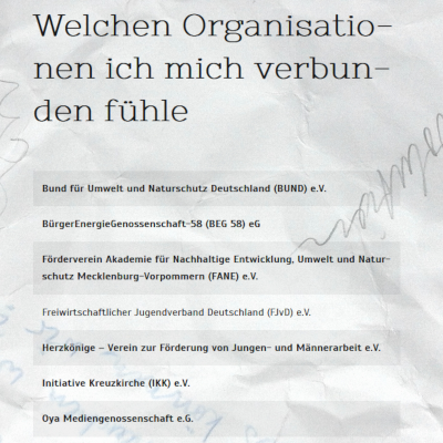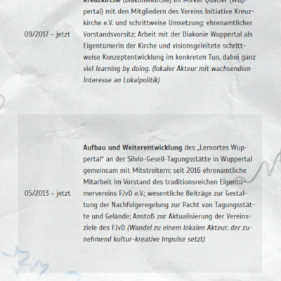 Für die berufliche Seite meines Engagements bildet das bzr (Büro für zukunftsfähige Regionalentwicklung) den formalen Rahmen. In den letzten Jahren habe ich mich vor allem ehrenamtlich in Vereinen, Initiativen und intentionalen, informellen Netzwerken betätigt, auch um für mich Neuland zu erschließen und mich in neuen Rollen auszuprobieren.
