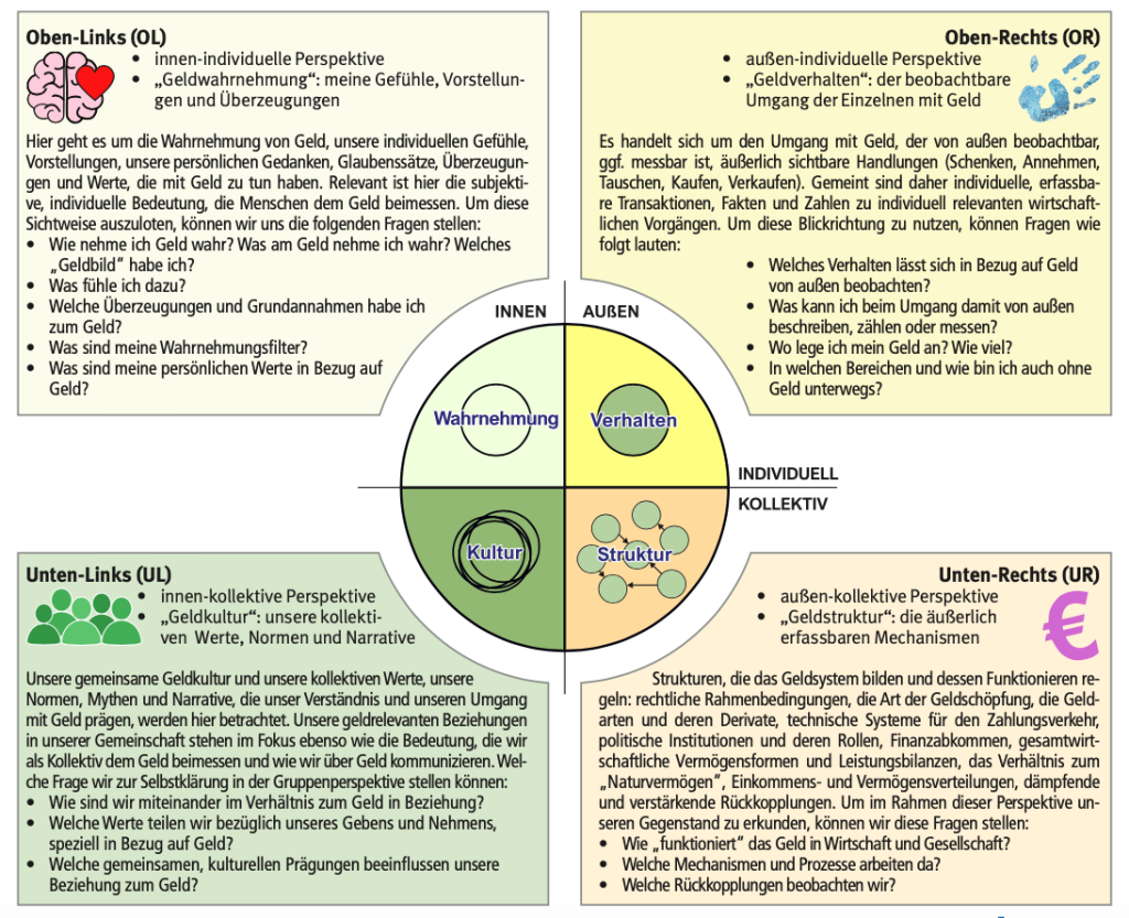 - Geldwahrnehmung: unsere jeweilige individuelle Wahrnehmung von Geld: Wie sehen wir Geld aus unserer persönlichen Innenschau? (innen-individuelle Perspektive)